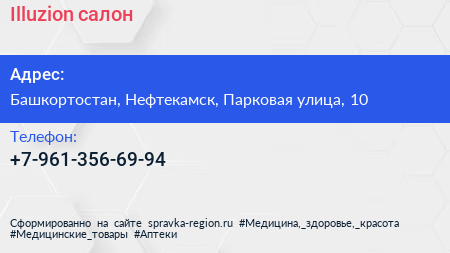 Illuzion, салон по адресу Башкортостан, Нефтекамск, Парковая улица, 10 в дальнейшем Организация, размещена в следующих категориях: