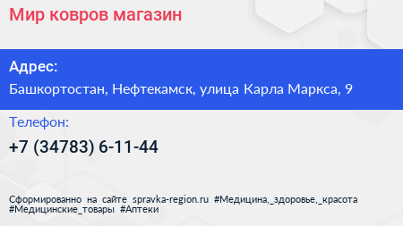 Мир ковров, магазин по адресу Башкортостан, Нефтекамск, улица Карла Маркса, 9 в дальнейшем Организация, размещена в следующих категориях:
