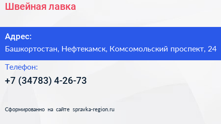 Швейная лавка по адресу Башкортостан, Нефтекамск, Комсомольский проспект, 24 в дальнейшем Организация, размещена в следующих категориях:
