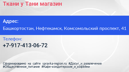 Ткани у Тани, магазин по адресу Башкортостан, Нефтекамск, Комсомольский проспект, 41 в дальнейшем Организация, размещена в следующих категориях: