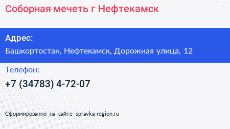 Соборная мечеть г. Нефтекамск по адресу Башкортостан, Нефтекамск, Дорожная улица, 12 в дальнейшем Организация, размещена в следующих категориях: