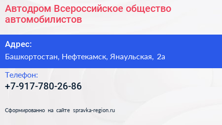 Автодром, Всероссийское общество автомобилистов по адресу Башкортостан, Нефтекамск, Янаульская, 2а в дальнейшем Организация, размещена в следующих категориях: