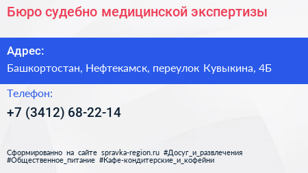 Бюро судебно-медицинской экспертизы по адресу Башкортостан, Нефтекамск, переулок Кувыкина, 4Б в дальнейшем Организация, размещена в следующих категориях: