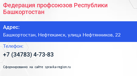 Федерация профсоюзов Республики Башкортостан по адресу Башкортостан, Нефтекамск, улица Нефтянников, 22 в дальнейшем Организация, размещена в следующих категориях: