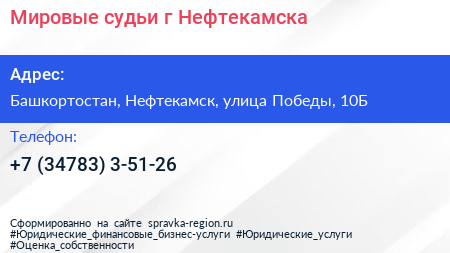 Мировые судьи г. Нефтекамска по адресу Башкортостан, Нефтекамск, улица Победы, 10Б в дальнейшем Организация, размещена в следующих категориях: