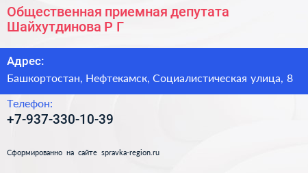 Общественная приемная депутата Шайхутдинова Р.Г. по адресу Башкортостан, Нефтекамск, Социалистическая улица, 8 в дальнейшем Организация, размещена в следующих категориях: