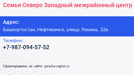 Семья, Северо-Западный межрайонный центр по адресу Башкортостан, Нефтекамск, улица Ленина, 22в в дальнейшем Организация, размещена в следующих категориях: