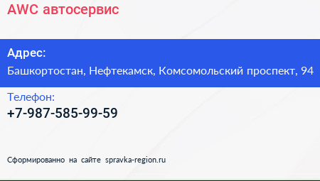 AWC, автосервис по адресу Башкортостан, Нефтекамск, Комсомольский проспект, 94 в дальнейшем Организация, размещена в следующих категориях: