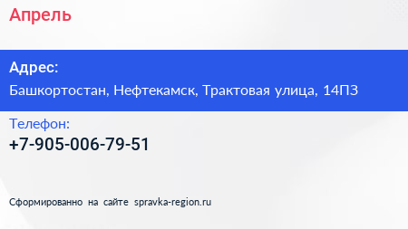 Апрель по адресу Башкортостан, Нефтекамск, Трактовая улица, 14ПЗ в дальнейшем Организация, размещена в следующих категориях: