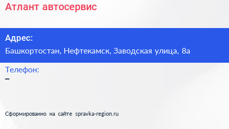 Атлант, автосервис по адресу Башкортостан, Нефтекамск, Заводская улица, 8а в дальнейшем Организация, размещена в следующих категориях: