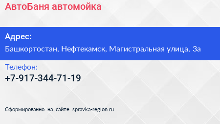 АвтоБаня, автомойка по адресу Башкортостан, Нефтекамск, Магистральная улица, 3а в дальнейшем Организация, размещена в следующих категориях: