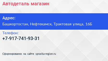 Автодеталь, магазин по адресу Башкортостан, Нефтекамск, Трактовая улица, 16Б в дальнейшем Организация, размещена в следующих категориях: