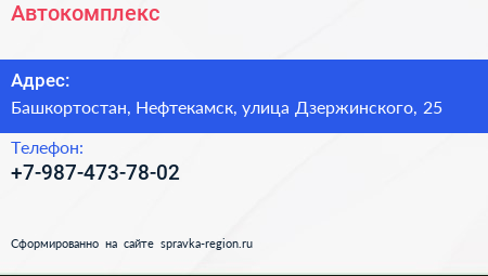 Автокомплекс по адресу Башкортостан, Нефтекамск, улица Дзержинского, 25 в дальнейшем Организация, размещена в следующих категориях: