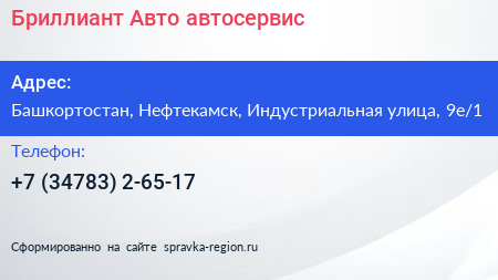 Бриллиант-Авто, автосервис по адресу Башкортостан, Нефтекамск, Индустриальная улица, 9е/1 в дальнейшем Организация, размещена в следующих категориях: