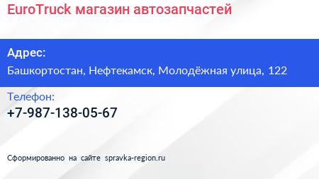 EuroTruck, магазин автозапчастей по адресу Башкортостан, Нефтекамск, Молодёжная улица, 122 в дальнейшем Организация, размещена в следующих категориях: