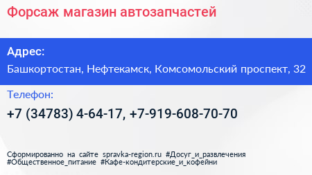 Форсаж, магазин автозапчастей по адресу Башкортостан, Нефтекамск, Комсомольский проспект, 32 в дальнейшем Организация, размещена в следующих категориях: