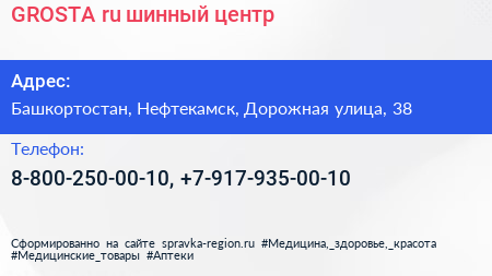GROSTA.ru, шинный центр по адресу Башкортостан, Нефтекамск, Дорожная улица, 38 в дальнейшем Организация, размещена в следующих категориях: