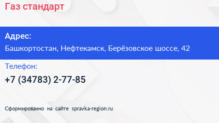 Газ-стандарт по адресу Башкортостан, Нефтекамск, Берёзовское шоссе, 42 в дальнейшем Организация, размещена в следующих категориях: