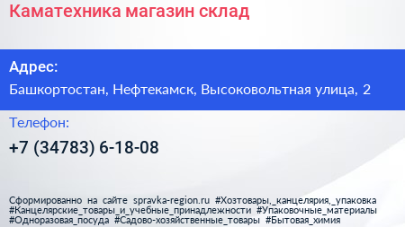 Каматехника, магазин-склад по адресу Башкортостан, Нефтекамск, Высоковольтная улица, 2 в дальнейшем Организация, размещена в следующих категориях: