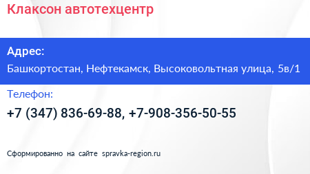 Клаксон, автотехцентр по адресу Башкортостан, Нефтекамск, Высоковольтная улица, 5в/1 в дальнейшем Организация, размещена в следующих категориях: