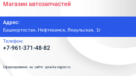 Магазин автозапчастей по адресу Башкортостан, Нефтекамск, Янаульская, 1г в дальнейшем Организация, размещена в следующих категориях:
