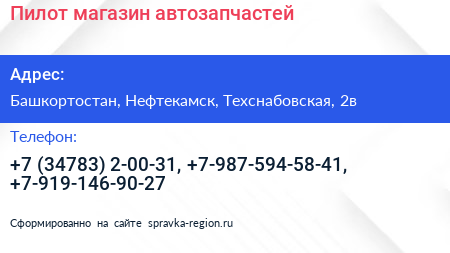 Пилот, магазин автозапчастей по адресу Башкортостан, Нефтекамск, Техснабовская, 2в в дальнейшем Организация, размещена в следующих категориях: