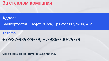 За стеклом, компания по адресу Башкортостан, Нефтекамск, Трактовая улица, 43г в дальнейшем Организация, размещена в следующих категориях: