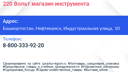 220 Вольт, магазин инструмента по адресу Башкортостан, Нефтекамск, Индустриальная улица, 10 в дальнейшем Организация, размещена в следующих категориях: