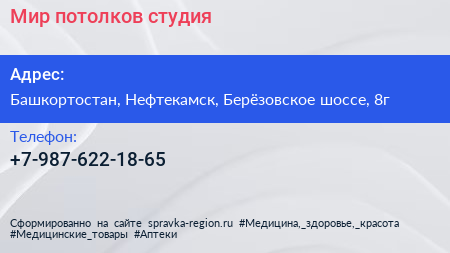 Мир потолков, студия по адресу Башкортостан, Нефтекамск, Берёзовское шоссе, 8г в дальнейшем Организация, размещена в следующих категориях: