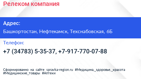 Релеком, компания по адресу Башкортостан, Нефтекамск, Техснабовская, 6Б в дальнейшем Организация, размещена в следующих категориях: