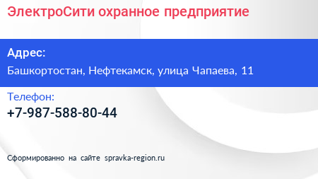 ЭлектроСити, охранное предприятие по адресу Башкортостан, Нефтекамск, улица Чапаева, 11 в дальнейшем Организация, размещена в следующих категориях: