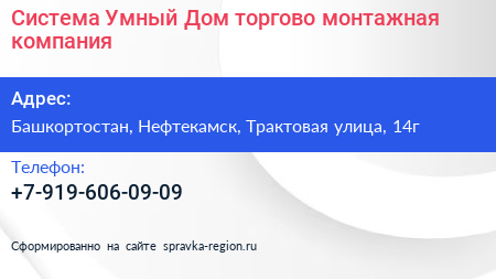 Система Умный Дом, торгово-монтажная компания по адресу Башкортостан, Нефтекамск, Трактовая улица, 14г в дальнейшем Организация, размещена в следующих категориях: