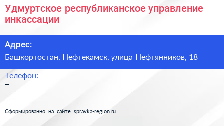 Удмуртское республиканское управление инкассации по адресу Башкортостан, Нефтекамск, улица Нефтянников, 18 в дальнейшем Организация, размещена в следующих категориях: