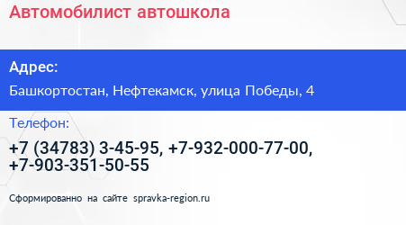 Автомобилист, автошкола по адресу Башкортостан, Нефтекамск, улица Победы, 4 в дальнейшем Организация, размещена в следующих категориях:
