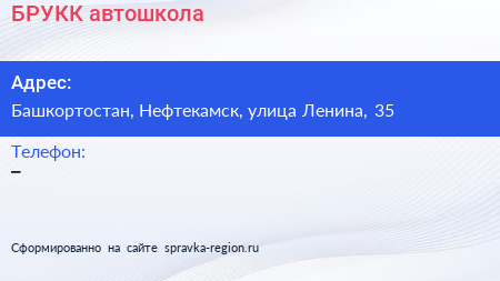 БРУКК, автошкола по адресу Башкортостан, Нефтекамск, улица Ленина, 35 в дальнейшем Организация, размещена в следующих категориях: