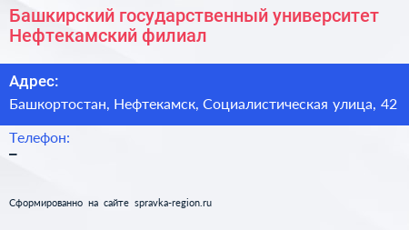 Башкирский государственный университет, Нефтекамский филиал по адресу Башкортостан, Нефтекамск, Социалистическая улица, 42 в дальнейшем Организация, размещена в следующих категориях: