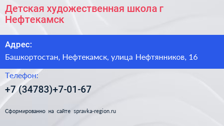 Детская художественная школа, г. Нефтекамск по адресу Башкортостан, Нефтекамск, улица Нефтянников, 16 в дальнейшем Организация, размещена в следующих категориях: