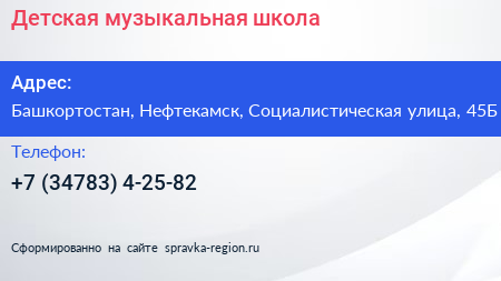Детская музыкальная школа по адресу Башкортостан, Нефтекамск, Социалистическая улица, 45Б в дальнейшем Организация, размещена в следующих категориях: