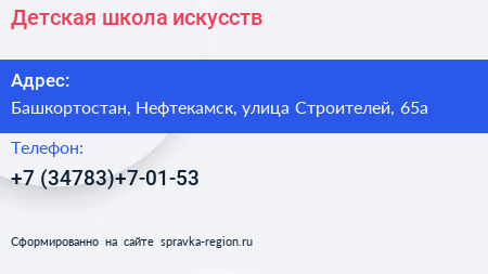 Детская школа искусств по адресу Башкортостан, Нефтекамск, улица Строителей, 65а в дальнейшем Организация, размещена в следующих категориях:
