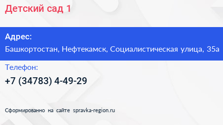 Детский сад №1 по адресу Башкортостан, Нефтекамск, Социалистическая улица, 35а в дальнейшем Организация, размещена в следующих категориях: