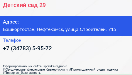 Детский сад №29 по адресу Башкортостан, Нефтекамск, улица Строителей, 71а в дальнейшем Организация, размещена в следующих категориях: