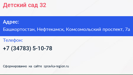 Детский сад №32 по адресу Башкортостан, Нефтекамск, Комсомольский проспект, 7а в дальнейшем Организация, размещена в следующих категориях:
