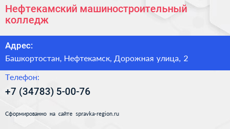 Нефтекамский машиностроительный колледж по адресу Башкортостан, Нефтекамск, Дорожная улица, 2 в дальнейшем Организация, размещена в следующих категориях: