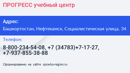 ПРОГРЕСС, учебный центр по адресу Башкортостан, Нефтекамск, Социалистическая улица, 34 в дальнейшем Организация, размещена в следующих категориях: