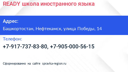READY, школа иностранного языка по адресу Башкортостан, Нефтекамск, улица Победы, 14 в дальнейшем Организация, размещена в следующих категориях: