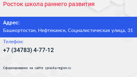 Росток, школа раннего развития по адресу Башкортостан, Нефтекамск, Социалистическая улица, 31 в дальнейшем Организация, размещена в следующих категориях: