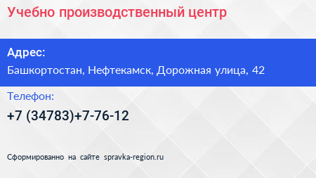 Учебно-производственный центр по адресу Башкортостан, Нефтекамск, Дорожная улица, 42 в дальнейшем Организация, размещена в следующих категориях: