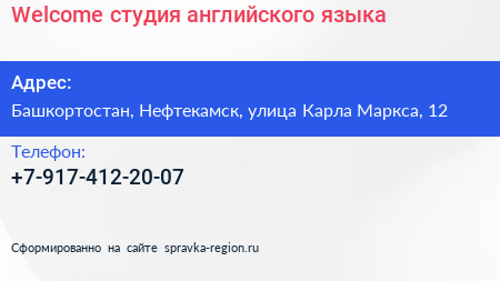 Welcome, студия английского языка по адресу Башкортостан, Нефтекамск, улица Карла Маркса, 12 в дальнейшем Организация, размещена в следующих категориях: