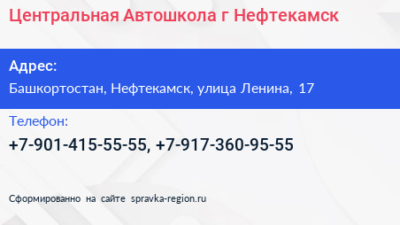 Центральная Автошкола, г. Нефтекамск по адресу Башкортостан, Нефтекамск, улица Ленина, 17 в дальнейшем Организация, размещена в следующих категориях: