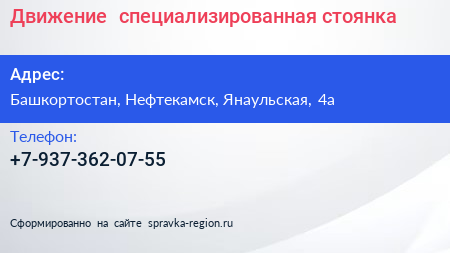 Движение+, специализированная стоянка по адресу Башкортостан, Нефтекамск, Янаульская, 4а в дальнейшем Организация, размещена в следующих категориях: